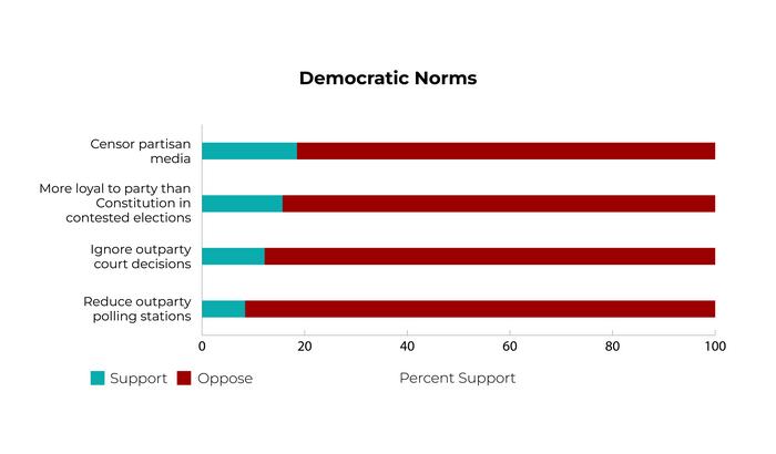 Respondents were surveyed on their support for four democratic norm violations: 1) if the number of polling stations in areas that typically support the other political party should be reduced; 2) if a candidate who questions an election outcome should be more loyalty to their own political party than election rules and the Constitution; 3) if current elected officials should consider ignoring court decisions issued by judges appointed by the opposing political party; and 4) if the government should be able to censor media that spends more time attacking their own political party than the other party.