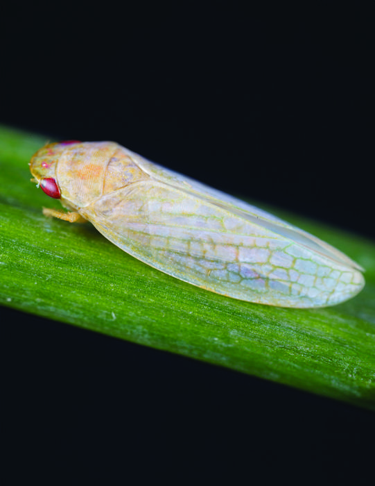 PICTURED IS A LEAFHOPPER G. SERPENTA. LIN WANG ET AL. STUDIED THE GEOMETRIC DESIGNS OF THE SURFACE COATINGS ON LEAFHOPPER BODIES. LEAFHOPPERS PRODUCE BROCHOSOMES TO COAT THEIR BODY SURFACES, WHICH ARE HOLLOW, NANOSCOPIC, BUCKYBALL-SHAPED SPHEROIDS WITH THROUGH-HOLES DISTRIBUTED ACROSS THEIR SURFACES. THE AUTHORS FOUND THAT THE THROUGH-HOLES OF THESE HOLLOW BUCKYBALLS PLAY AN IMPORTANT ROLE IN REDUCING THE REFLECTION OF LIGHT. THIS IS THE FIRST BIOLOGICAL EXAMPLE SHOWING SHORT WAVELENGTH, LOW-PASS ANTIREFLECTION FUNCTIONALITY ENABLED BY THROUGH-HOLES AND HOLLOW STRUCTURES.