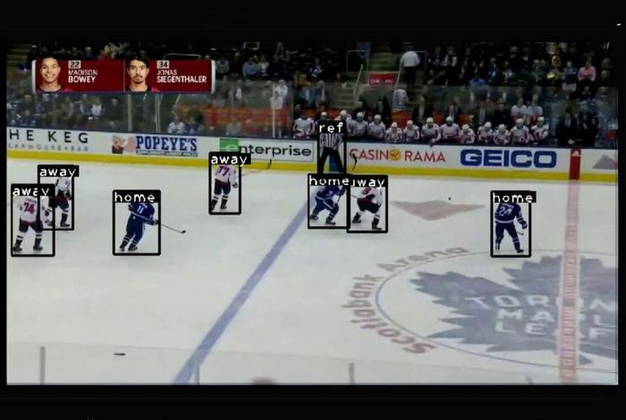 Hockey players move fast in a non-linear fashion, dynamically skating across the ice in short shifts. Apart from numbers and last names on jerseys that are not always visible to the camera, uniforms aren’t a robust tool to identify players — particularly at the fast-paced speed hockey is known for. This makes manually tracking and analyzing each player during a game very difficult and prone to human error.