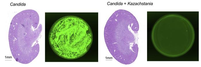 C. ALBICANS SPREADS TO THE KIDNEYS OF IMMUNOSUPPRESSED MICE (LEFT), BUT INVASIVE CANDIDIASIS IS MITIGATED BY EXPOSURE TO K. WEIZMANNII (RIGHT).