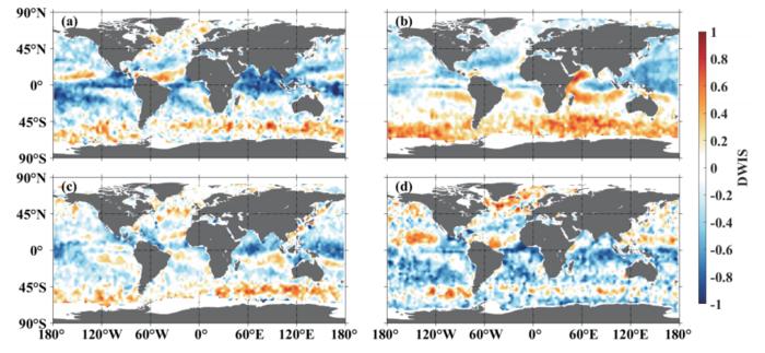 Global-scale wave observations are challenging, especially in terms of wave spectra. Consequently, investigations on wind stress characteristics using measured wave spectra are scarce. The research team applied a self-developed wave boundary layer model to CFOSAT, evaluating the contribution of surface wave-induced stress to wind stress on a global scale during the boreal summer and autumn seasons. The related results were published in November 2020 in Journal of Geophysical Research-Oceans. However, due to the limitation of data, the seasonal variations of wave-induced stress are still unclear. Therefore, the seasonal characteristics of global sea surface wave-induced stress and wind stress were analyzed by combining one-year wind and wave observations from CFOSAT with the wave boundary layer model in the present paper. Further analysis showed that from spring to winter, larger wave-induced stress are primarily distributed in the Southern Hemisphere westerly belt and high-latitude areas of the North Atlantic, while smaller values are mainly distributed near the equator(Figure 1). The percentage of increase or decrease in wind stress after considering the wave-induced stress showed a roughly symmetrical pattern between the NH and SH during the spring and autumn seasons, while the summer and winter seasons showed an asymmetrical feature. Wave-induced stress significantly modulated wind stress, resulting in zonal mean variations by up to ±30% (Figure 2). This finding further highlights the important modulation of surface waves on wind stress at the global scale.