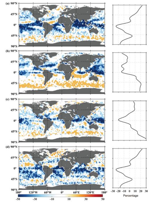 Global-scale wave observations are challenging, especially in terms of wave spectra. Consequently, investigations on wind stress characteristics using measured wave spectra are scarce. The research team applied a self-developed wave boundary layer model to CFOSAT, evaluating the contribution of surface wave-induced stress to wind stress on a global scale during the boreal summer and autumn seasons. The related results were published in November 2020 in Journal of Geophysical Research-Oceans. However, due to the limitation of data, the seasonal variations of wave-induced stress are still unclear. Therefore, the seasonal characteristics of global sea surface wave-induced stress and wind stress were analyzed by combining one-year wind and wave observations from CFOSAT with the wave boundary layer model in the present paper. Further analysis showed that from spring to winter, larger wave-induced stress are primarily distributed in the Southern Hemisphere westerly belt and high-latitude areas of the North Atlantic, while smaller values are mainly distributed near the equator(Figure 1). The percentage of increase or decrease in wind stress after considering the wave-induced stress showed a roughly symmetrical pattern between the NH and SH during the spring and autumn seasons, while the summer and winter seasons showed an asymmetrical feature. Wave-induced stress significantly modulated wind stress, resulting in zonal mean variations by up to ±30% (Figure 2). This finding further highlights the important modulation of surface waves on wind stress at the global scale.