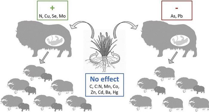 Areas with more copper and selenium in the ground lead to higher reproductive success in wild musk oxen in Greenland.