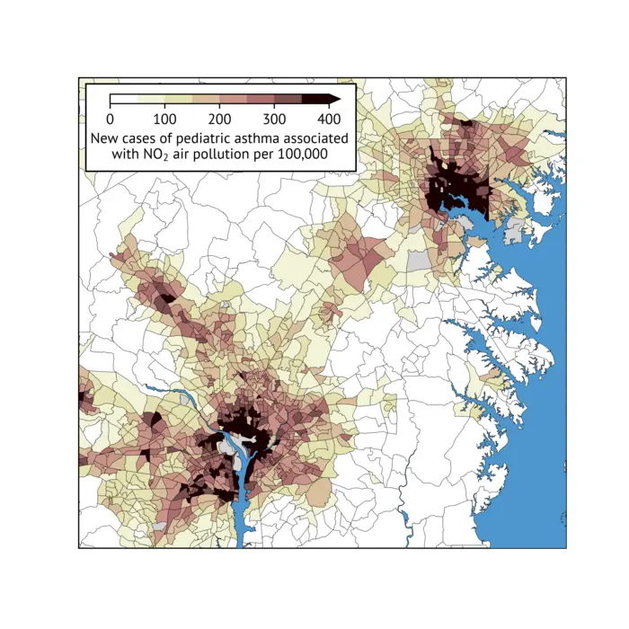 THE GRAPHIC SHOWS NEW CASES OF PEDIATRIC ASTHMA LINKED TO NITROGEN DIOXIDE AIR POLLUTION IN THE DC AND BALTIMORE REGION. THE DARK BROWN AREAS INDICATE THE HIGHEST NUMBER OF NEW CASES, WHICH THE STUDY LINKED TO NEIGHBORHOODS WITH A LARGER PROPORTION OF MARGINALIZED RESIDENTS.