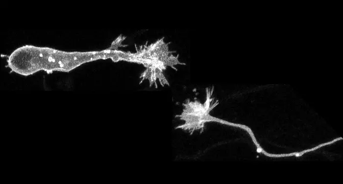 COLLECTIVE TIME-LAPSE IMAGES OF A MIGRATING NEURON (LEFT) AND AN ELONGATING AXON (RIGHT) FROM SUPER-RESOLUTION MICROSCOPY. GROWTH CONES AT THE TIPS OF THE NEURONS ARE EXTENDED WHILE THE CELL BODY MIGRATES AND THE AXON ELONGATES.