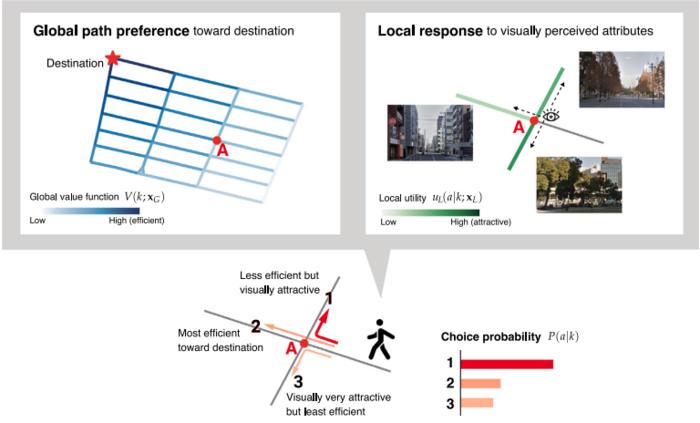 One essential aspect in analyzing walkability is understanding traveler behavior. Before and during their journey, various factors can influence their path choices. For example, travelers can consider the most efficient route before starting but could encounter unexpected events necessitating route changes. Factors like surface conditions, traffic lights or a more scenic view can also influence their decisions. As such, the path choice of travelers can be categorized into two routing mechanisms - global path preferences and local responses to the perceived attributes of the path. While global preferences like the total distance can play a role, pedestrians often prioritize locally perceived attributes. Thus, it is necessary to understand to what extent and which attributes influence the global and local preferences of travelers and related design policies.
