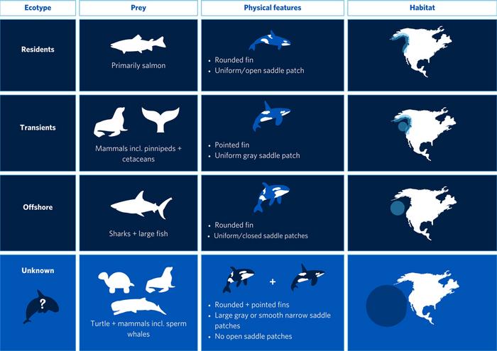 AN INFOGRAPHIC SHOWING THE DIFFERENCES BETWEEN THE THREE ORCA ECOTYPES THAT LIVE ALONG THE COASTS OF CALIFORNIA AND OREGON AND THE POTENTIAL UNIQUE POPULATION