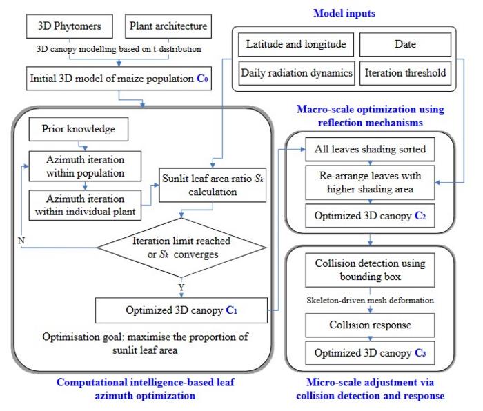 The computational process, though time-intensive, highlights the efficiency and potential of computational intelligence in 3D canopy modeling. The iterative optimization of sunlit leaf area ratios and the intelligent adjustment of 3D phytomers' azimuth angles reflect the application of swarm intelligence principles to crop canopy modeling. The study highlights the significance of precise crop canopy modeling to comprehend plant competition for light resources. It suggests further enhancements and future work to improve the models' accuracy and practicality by considering a broader range of environmental factors and incorporating more detailed phenotypic and growth information.