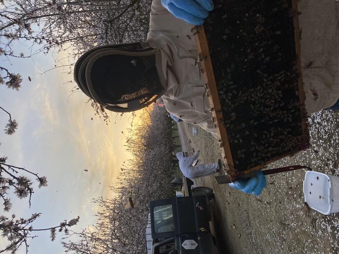 Washington State University researchers and students collect samples and perform honey bee colony health assessments in orchards near Modesto, CA. Every year more than 2 million honey bee hives from across the country are moved to California to pollinate almond trees in February. To manage bee health and the logistics of the move, many commercial beekeepers are starting to use indoor cold storage for their hives – a practice that researchers have found might also help prevent colony collapses from longer, warm autumns due to climate change.