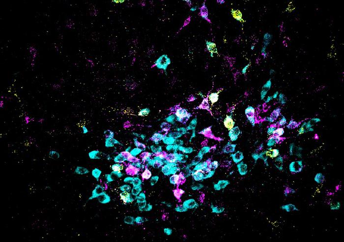 NEW RESEARCH PUBLISHED IN SCIENCE IDENTIFIES THE BRAIN BIOCHEMISTRY AND NEURAL CIRCUITRY THAT CAUSE GENERALIZED FEAR EXPERIENCES. HERE, NEURONS ARE SHOWN IN CYAN AND RETROGRADE TRACERS SHOWN IN YELLOW AND MAGENTA.
