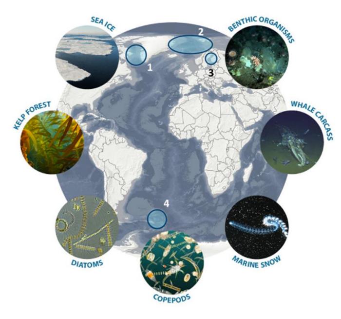 Map showing 4 representative locations where SEA-Quester will document and quantify ecosystem changes associated with blue carbon storage: 1) West Greenland, 2) Norwegian sea spanning from East Greenland to Svalbard, 3) the Baltic Sea and 4) the Southern Ocean. SEA-Quester also plans to work across multiple taxa and habitats, from the benthos to the open ocean.