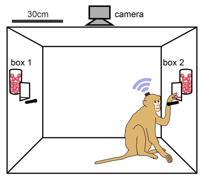 For the study, a team of researchers from Germany and the USA trained two rhesus monkeys to explore an experimental room with two button-controlled food boxes. Each time the monkeys pressed a button on one of the boxes, they had the chance to receive food pellets. The two boxes were set in such a way that the time intervals between the individual food dispenses became longer and longer during an experimental run. The longer the monkeys waited until they pressed the button again, the more pellets they received.