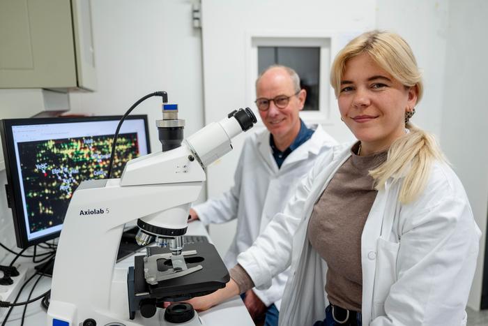 DR. ANNA-MARIA MÖLLER, FIRST AUTHOR OF THE CURRENT STUDY, AND PROFESSOR FRANZ NARBERHAUS (LEFT) FOCUS ON THE MODE OF ACTION OF ANTIBIOTIC AGENTS.