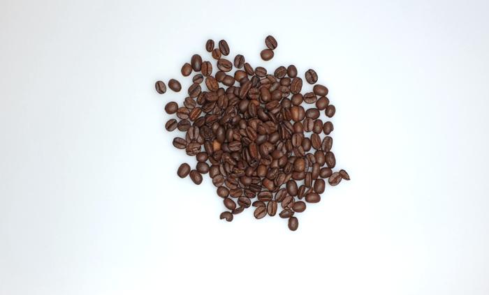 ROASTED COFFEE BEANS IN A PILE ON WHITE BACKGROUND.