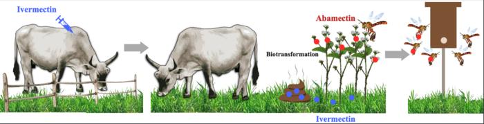 POTENTIAL ROUTE OF AVERMECTIN EXPOSURE IN STINGLESS BEE COLONIES LOCATED IN LIVESTOCK DOMINATED LANDSCAPES. WHEN IVERMECTIN IS APPLIED TO CATTLE TO TREAT ENDO AND ECTOPARASITES, RESIDUES END UP IN THE URINE AND FECES, WHICH FLOWERING PLANTS CAN ABSORB. INSIDE THE PLANT, IVERMECTIN CAN BIOTRANSFORM INTO ABAMECTIN THROUGH DESATURASE ENZYMES AND CONTAMINATE THE POLLEN. BEES FORAGE CONTAMINATED POLLEN THAT IS TRANSPORTED TO THEIR COLONIES.