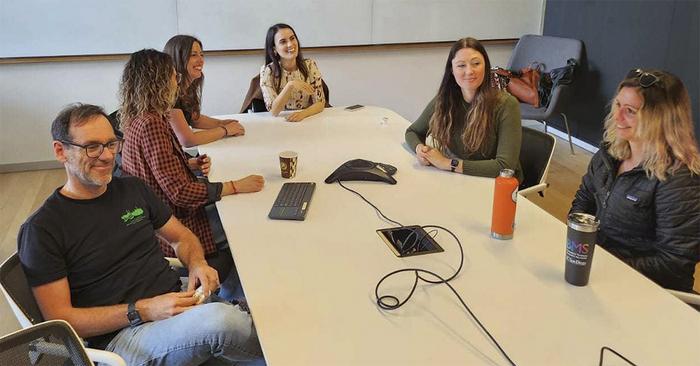 COLLABORATORS FROM THE UNIVERSITY OF CALIFORNIA, SAN DIEGO DISCUSS THEIR EXAMINATION OF A 3-MILLION-INDIVIDUAL 23ANDME DATABASE. THE GROUP INCLUDES (CLOCKWISE FROM LEFT) ABRAHAM A. PALMER, LAURA VILAR-RIBO, RENATA B. CUPERTINO, SANDRA SANCHEZ-ROIGE, NATASIA COURCHESNE-KRAK AND MARIELA V JENNINGS.