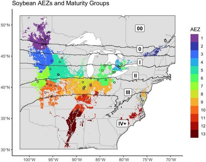 MAPS FROM THE UNIVERSITY OF ILLINOIS URBANA-CHAMPAIGN STUDY SUGGEST OPTIMAL TESTING SITES BASED ON AGROECOLOGICAL ZONES (AEZS) AND SOYBEAN MATURITY GROUPS (00 TO IV+).