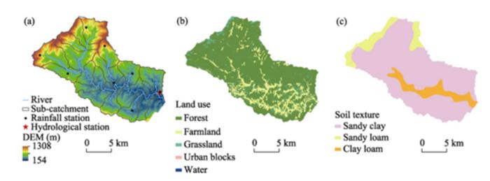 SPATIAL DISTRIBUTION OF DEM AND WATER SYSTEM (A), LAND USE (B) AND SOIL TEXTURE TYPES (C) IN ANHE CATCHMENT