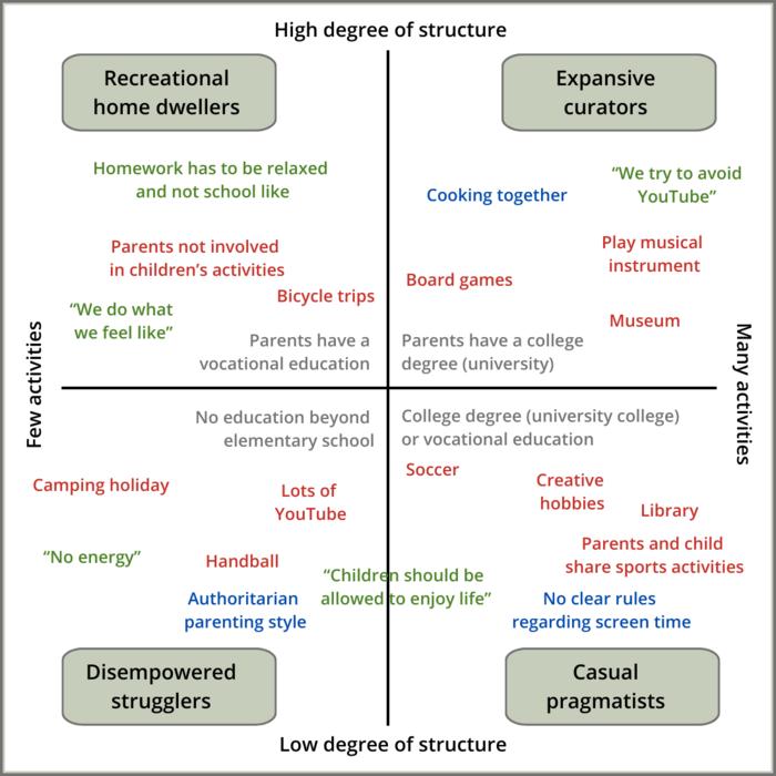 Nevertheless, the categories provide a new, Scandinavian perspective on children's learning environments, as the study also includes children's school, institutional and leisure lives. The 'casual pragmatists' and 'recreational home dwellers' are very much products of the Scandinavian welfare regime and reflect other forms of inequality than those in economic and social typically of Anglo-Saxon countries.