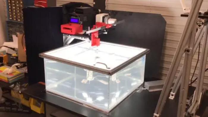 A LIVE RECORDING OF THE EXPERIMENTAL APPARATUS IN OPERATION. FIVE FOILS ARE DRIVEN TO FLAP UP AND DOWN IN UNISON, AND THEY FREELY AND INTERACTIVELY PROPEL AROUND A WATER TANK.