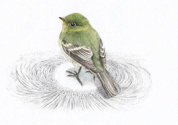 THE YELLOW-BELLIED FLYCATCHER (EMPIDONAX FLAVIVENTRIS) IS A SMALL INSECTIVORE OF THE TYRANT FLYCATCHER FAMILY THAT CANNOT PRODUCE THE PROTEIN CRYPTOCHROME 4. THE BIRDS BREED IN NORTH AMERICA AND MIGRATE TO SOUTHERN MEXICO AND CENTRAL AMERICA IN WINTER.