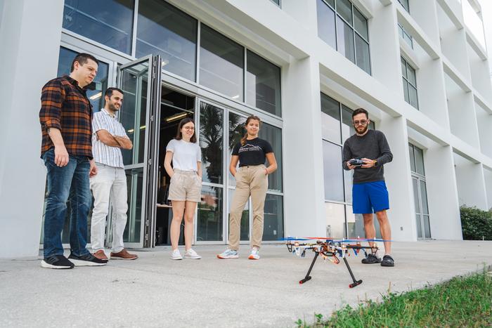 (LEFT TO RIGHT) TANSEL YUCELEN, UNIVERSITY OF SOUTH FLORIDA ASSOCIATE PROFESSOR OF MECHANICAL ENGINEERING, EMRE YILDIRIM, DOCTORATE STUDENT, DENIZ KURTOGLU, DOCTORATE STUDENT, REBECCA HARRISON, DOCTORATE STUDENT, AND SAMUEL CARRARA, UNDERGRADUATE STUDENT, WORKING ON AUTONOMOUS CONTROL OF UNMANNED AERIAL SYSTEMS.