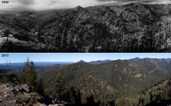 The top and bottom images both show Bethel Ridge in Washington state. The top image, taken in 1936, shows a mosaic forest. The darkest grey tones are mature, moist, mixed-conifer forests. In the bottom image, taken in 2012, the forest has become more uniform and dense following decades without fire.