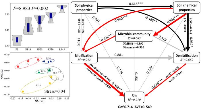 THE TWO FIGURES ON THE LEFT SHOW THE DIVERSITY OF MICROBIAL N-CYCLING POTENTIAL. THE PANEL ON THE RIGHT SHOWS THE DRIVING MECHANISM FOR CHANGES IN SOIL MINERALIZATION RATES.