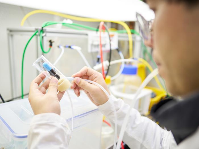 Nanji Jiang takes flies for the experiments. They had previously been exposed to ozone, which had been introduced into the tube through the blue diffuser.