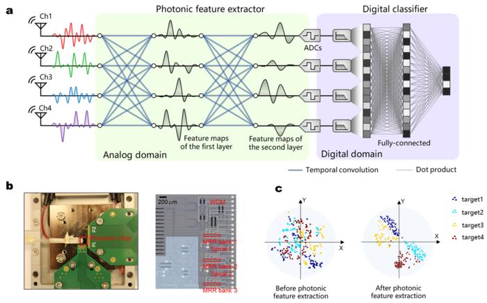 In a new paper published in Light Science & Application, a team of scientists, led by Professor Weiwen Zou from State Key Laboratory of Advanced Optical Communication Systems and Networks, Intelligent Microwave Lightwave Integration Innovation Center (imLic), Department of Electronic Engineering, Shanghai Jiao Tong University, and co-workers have developed a photonic scheme to accomplish AFE of broadband RF signals. In principle, photonics is considered a competitive candidate for RF signal processing due to its broadband capability and reconfigurability. If the physical structure of feature extraction in implemented in the photonic circuits, the input signals can be directly transformed into features without digital processing. Based on this idea, they implemented a photonic chip that can output key features directly from the original RF signals received by the antenna. With these features, different targets are recognized with high accuracy. The reported scheme will provide a promising path for the efficient signal processing involved in autonomous driving, robotics, and smart factories.
