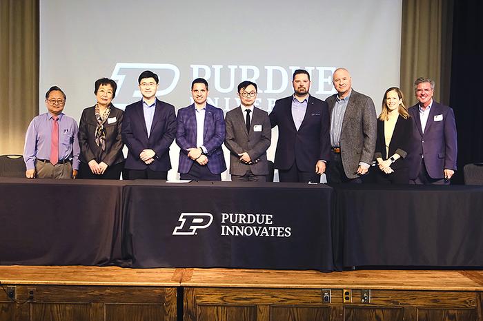 REPRESENTATIVES FROM REELEMENT TECHNOLOGIES, PURDUE UNIVERSITY, PURDUE INNOVATES AND INDUSTRY HAVE SIGNED A LICENSE THAT ALLOWS REELEMENT TO USE PATENTED TECHNOLOGIES CREATED IN PURDUE’S COLLEGE OF ENGINEERING. THE TECHNOLOGIES WILL ALLOW REELEMENT TECHNOLOGIES TO DOMESTICALLY REFINE AND SELL MINERALS CRITICAL IN MANUFACTURING MODERN, HIGH-TECH PRODUCTS FOR COMMERCIAL AND INDUSTRIAL USE. STANDING FROM LEFT ARE SANGTAE KIM, THE JAY AND CYNTHIA IHLENFELD HEAD OF CHEMICAL ENGINEERING AND DISTINGUISHED PROFESSOR, DAVIDSON SCHOOL OF CHEMICAL ENGINEERING; NIEN-HWA “LINDA” WANG, THE DR. NORMAN AND DR. JANE LI PROFESSOR IN CHEMICAL ENGINEERING, DAVIDSON SCHOOL OF CHEMICAL ENGINEERING; MUNG CHIANG, PRESIDENT, PURDUE UNIVERSITY; MARK JENSEN, CEO, REELEMENT TECHNOLOGIES; YI DING, DIRECTOR OF RESEARCH AND DEVELOPMENT, REELEMENT TECHNOLOGIES; BEN WRIGHTSMAN, PRESIDENT, REELEMENT TECHNOLOGIES; BRIAN EDELMAN, PRESIDENT, PURDUE RESEARCH FOUNDATION; BROOKE BEIER, SENIOR VICE PRESIDENT, PURDUE INNOVATES; AND DAN HASLER, FOUNDER AND PRESIDENT, HASLER VENTURES LLC.