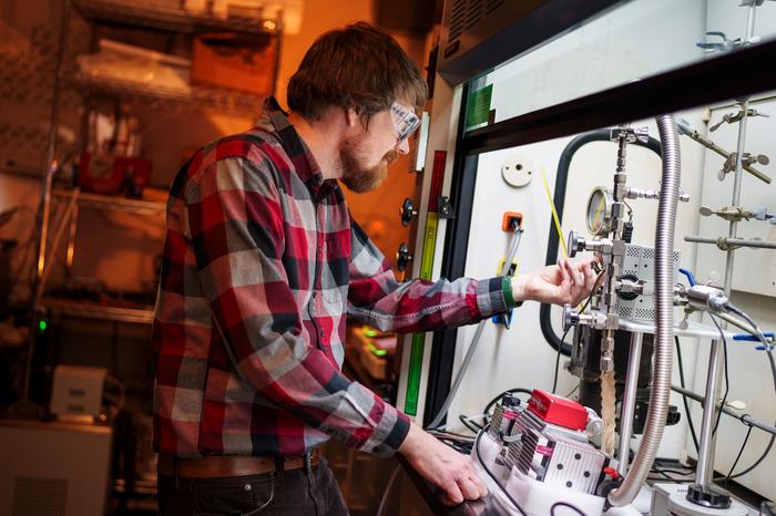 MATTHEW PAUL, A SANDIA NATIONAL LABORATORIES GEOSCIENCES ENGINEER, WORKS ON A GAS ADSORPTION SYSTEM IN A FUME HOOD AS PART OF A PROJECT TO SEE IF DEPLETED PETROLEUM RESERVOIRS CAN BE USED FOR STORING CARBON-FREE HYDROGEN FUEL.