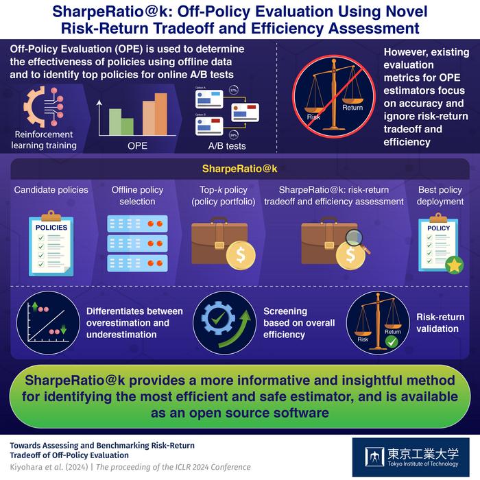 SHARPERATIO@K, A NOVEL EVALUATION METRIC FOR OFF-POLICY EVALUATION ESTIMATORS, EFFECTIVELY MEASURES THE RISK-RETURN TRADEOFF OF EVALUATING POLICIES USED IN REINFORCEMENT LEARNING AND CONTEXTUAL BANDITS, WHICH ARE TYPICALLY IGNORED BY CONVENTIONAL METRICS, SHOW SCIENTISTS AT TOKYO TECH. THIS NOVEL METRIC, INSPIRED FROM RISK ASSESSMENT IN FINANCIAL PORTFOLIO MANAGEMENT, PROVIDES A MORE INSIGHTFUL EVALUATION OF OPE, PAVING THE WAY FOR IMPROVED POLICY SELECTION.