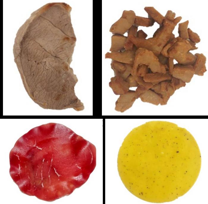 MEAT PRODUCTS (TOP LEFT, VEAL; BOTTOM LEFT, BRESAOLA) TEND TO CONTAIN MORE PROTEINS AND AMINO ACIDS THAN THEIR PLANT-BASED ALTERNATIVES (RIGHT).