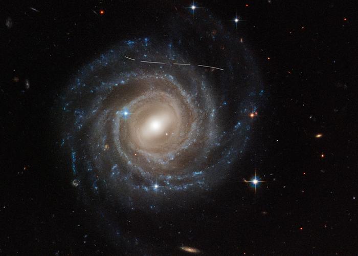 THIS HUBBLE SPACE TELESCOPE IMAGE OF THE BARRED SPIRAL GALAXY UGC 12158 LOOKS LIKE SOMEONE TOOK A WHITE MARKING PEN TO IT. IN REALITY IT IS A COMBINATION OF TIME EXPOSURES OF A FOREGROUND ASTEROID MOVING THROUGH HUBBLE'S FIELD-OF-VIEW, PHOTOBOMBING THE OBSERVATION OF THE GALAXY. SEVERAL EXPOSURES OF THE GALAXY WERE TAKEN, WHAT IS EVIDENCE IN THE DASHED PATTERN. THE ASTEROID APPEARS AS A CURVED TRAIL DUE TO PARALLAX: BECAUSE HUBBLE IS NOT STATIONARY, BUT ORBITING EARTH, AND THIS GIVES THE ILLUSION THAT THE FAINT ASTEROID IS SWIMMING ALONG A CURVED TRAJECTORY. THE UNCHARTED ASTEROID IS IN INSIDE THE ASTEROID BELT IN OUR SOLAR SYSTEM, AND HENCE IS 10 TRILLION TIMES CLOSER TO HUBBLE THAN THE BACKGROUND GALAXY. RATHER THAN A NUISANCE, THIS TYPE OF DATA ARE USEFUL TO ASTRONOMERS FOR DOING A CENSUS OF THE ASTEROID POPULATION IN OUR SOLAR SYSTEM.
