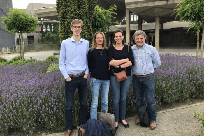 FROM LEFT TO RIGHT: DR. ARNOUT BRUGGEMAN (VIB-UGENT-UZ GENT), PROF. DEBBY LAUKENS (UGENT), PROF. ROOSMARIJN VANDENBROUCKE (VIB-UGENT), AND PROF. PATRICK SANTENS (UZ GENT)