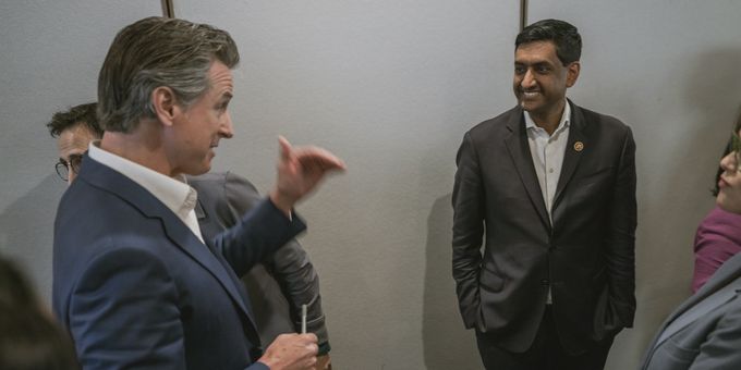 California's Democratic Gov. Gavin Newsom talks with Rep. Ro Khanna (D-Calif.) during the event in Los Angeles on Thursday, April 4, 2024.