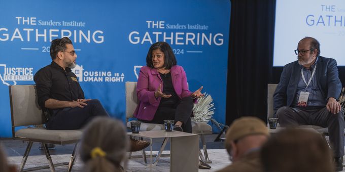 Also on the climate front—which highlighted the intersectional style of the Sanders Institute's gathering—Congresswoman Jayapal joined with author and labor organizer Saket Soni as well as Jamie Court of the California-based Consumer Watchdog, an advocacy group, to discuss the linked issues of community resilience amid extreme weather disasters and soaring insurance costs that have arrived hand-in-hand with rising global temperatures.