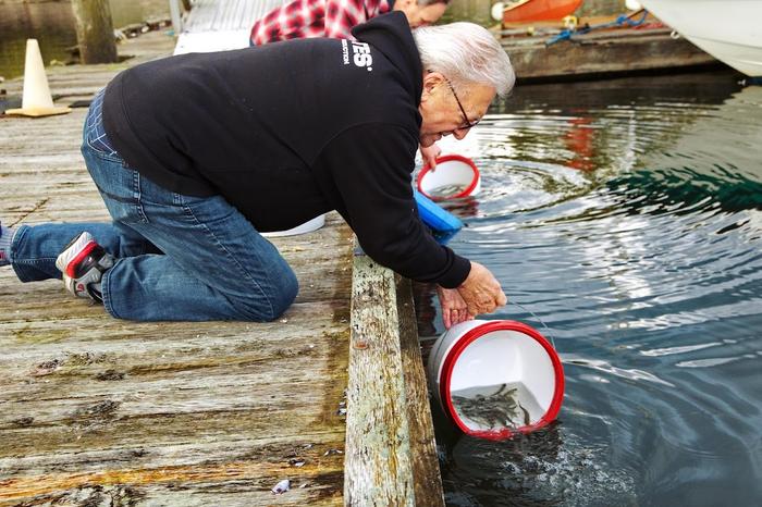 MOSSOM VOLUNTEER BRIAN LARSON IS GENTLY RELEASING TAGGED COHO INTO BURRARD INLET FROM THE IOCO BOAT CLUB IN PORT MOODY.