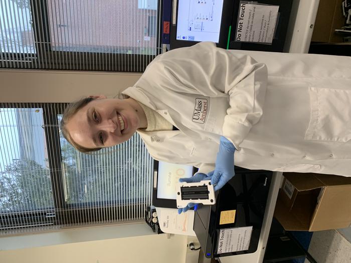 KATIE RICKELTON PREPARING TO SEQUENCE PRIMATE RNA AT THE UMASS IALS GENOMICS CORE.
