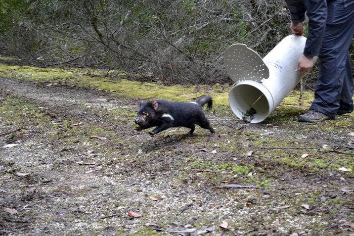 RESEARCHERS RELEASE A TASMANIAN DEVIL AS PART OF A STUDY OF HOW GENOMIC RESEARCH MAY BE KEY TO UNDERSTANDING CANCER IN THE ANIMALS.