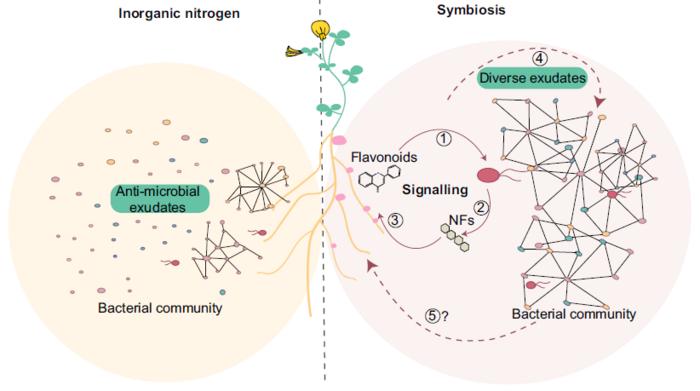 In the new study, the team found that the communities of bacteria around the roots and in the surrounding soil differ depending on and have predictive power of the plant's nitrogen status. Moreover, it was found that signalling exchange between legume and its symbiont plays a critical role in modulating the profile of root secreted molecules, influencing the assembly of a symbiotic root microbiome.