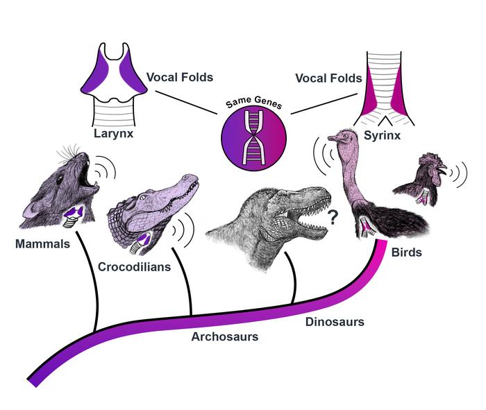 RECENT RESEARCH HAS REVEALED A COMMON GENETIC LINK BETWEEN THE LARYNX – THE VOCAL ORGAN OF MAMMALS, REPTILES, AND AMPHIBIANS – AND THE SYRINX – THE VOCAL ORGAN OF BIRDS. THIS FIGURE ILLUSTRATES THE EVOLUTION OF THE LARYNX AND SYRINX IN DIFFERENT ANIMAL LINEAGES. ALTHOUGH BIRDS ARE DIRECT DESCENDANTS OF DINOSAURS AND HAVE BOTH A LARYNX AND A SYRINX, IT’S UNKNOWN IF DINOSAURS HAD EITHER ORGAN.