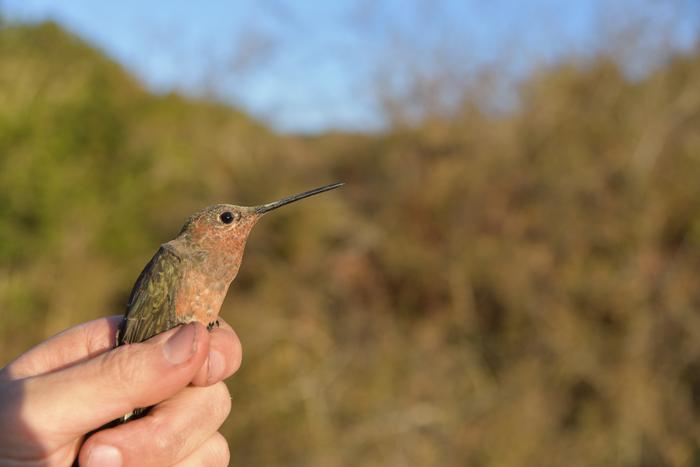 Southern Giant Hummingbird with a geolocator backpack in Valparaíso Region, Chile.