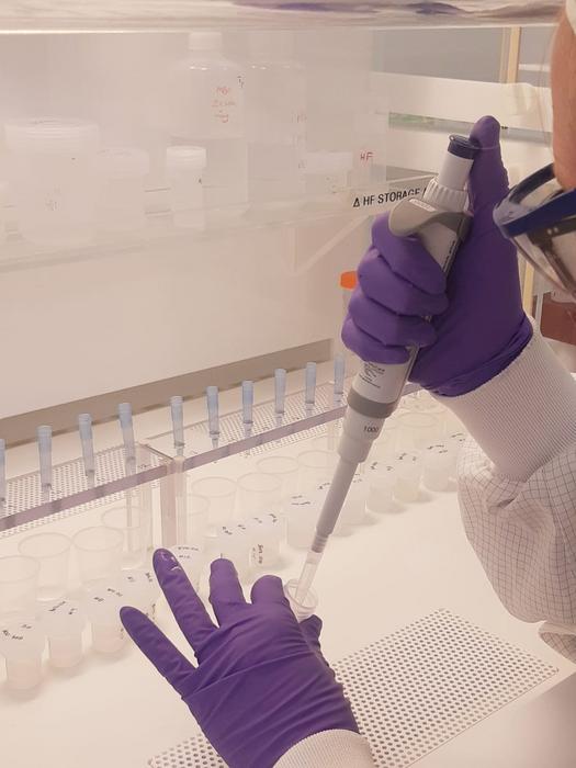 Project lead Dr Katherine French uses column chromatography to collect strontium isotopes from horse dental enamel samples.