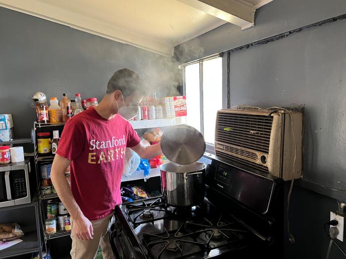 Colin Finnegan of the Stanford Doerr School of Sustainability checks a simmering pot on a gas stove that does not have a range hood. Using a range hood that vents air to the outdoors can dramatically influence how much nitrogen dioxide fills the air in a home.