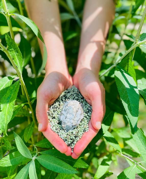 A PERSON'S HANDS CUP A SAMPLE OF PELLETIZED AGRICULTURAL FERTLIZER AND A PIECE OF THE PHOSPHATE ROCK FROM WHICH IT IS CREATED.