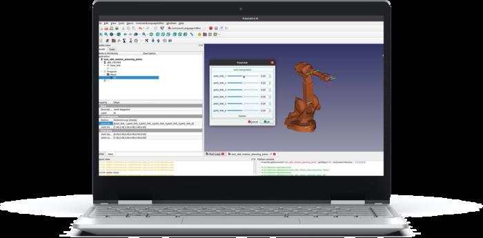 - Environmental Modeling: Create or import a CAD model of your robot, including fixtures and end-of-arm-tooling. Manipulate and control robot model using joint sliders and simulate tool movement with an intuitive dragger to evaluate and calculate joint configurations.