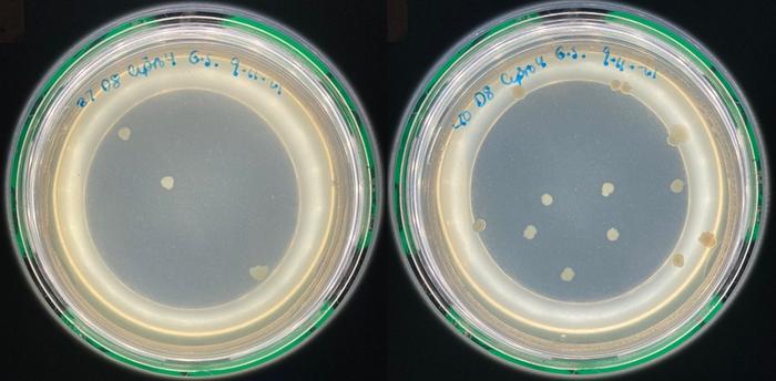 COLONIES OF THE BACTERIUM E. COLI GROWING ON AN AGAR PLATE CONTAINING CIPROFLOXACIN: THESE RESISTANT COLONIES ORIGINATE FROM MUTANTS. ON THE LEFT THE RESISTANT MUTANTS ORIGINATING FROM A POPULATION GROWN AT 37 °C (NORMAL BODY TEMPERATURE), ON THE RIGHT RESISTANT MUTANTS ORIGINATING FROM A POPULATION GROWN AT 40 °C (FEVER TEMPERATURE).