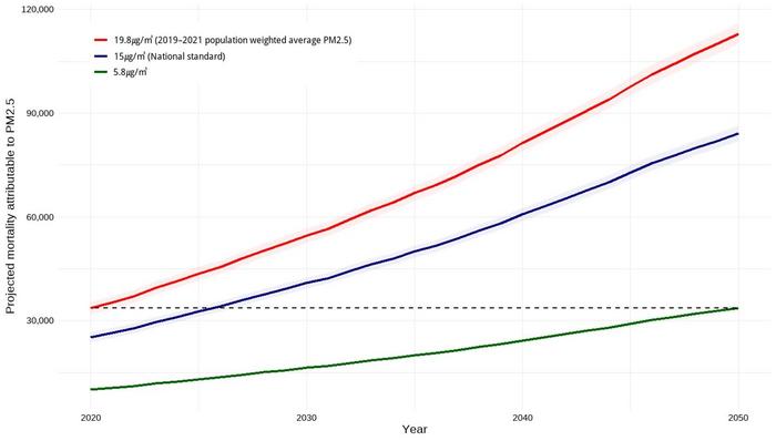 Further investigation by the team concluded that reducing PM2.5 concentrations to approximately 6 µg/m³ would be necessary to maintain the mortality levels of 2020 by 2050. Despite an overall decline in population, the proportion of older individuals, who are particularly susceptible to PM2.5, is expanding rapidly. Consequently, in order to mitigate the death toll and public health burden, reductions in PM2.5 concentrations would need to significantly surpass current policy measures.